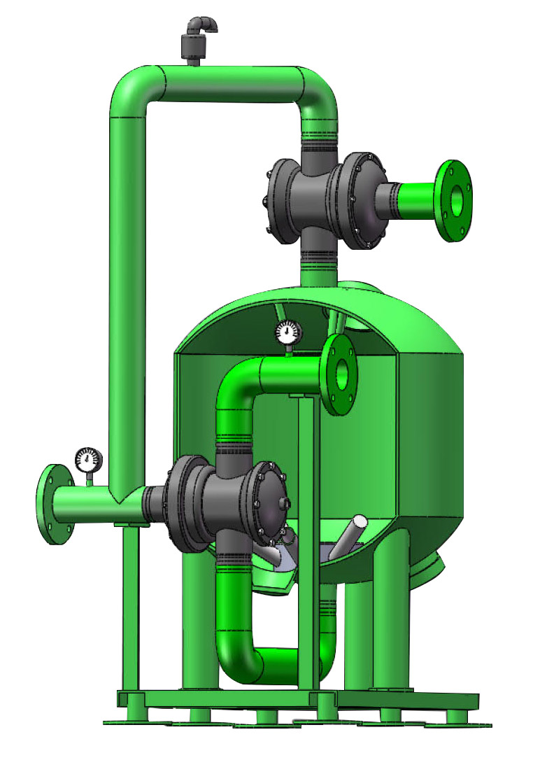隨時雜質在濾料層中不斷聚積,壓力損失不斷增加,當壓差增加到某一設定值時或到達設定的清洗時,系統(tǒng)將自動轉換至反洗狀態(tài)。加壓水通過集水裝置進入濾料層,對其進行沖刷,使截留的污染物脫落并排出過濾系統(tǒng)。反洗持續(xù)至少2分鐘后,閥門自動將系統(tǒng)轉至過濾狀態(tài)。